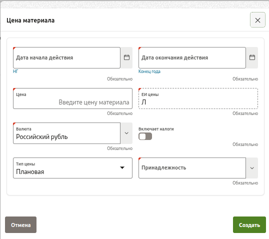 | Дата начала действия | Дата, с которой начинает действовать цена на материал. При нажатии на "НГ" выставится дата: 01.01.*текущий год* |