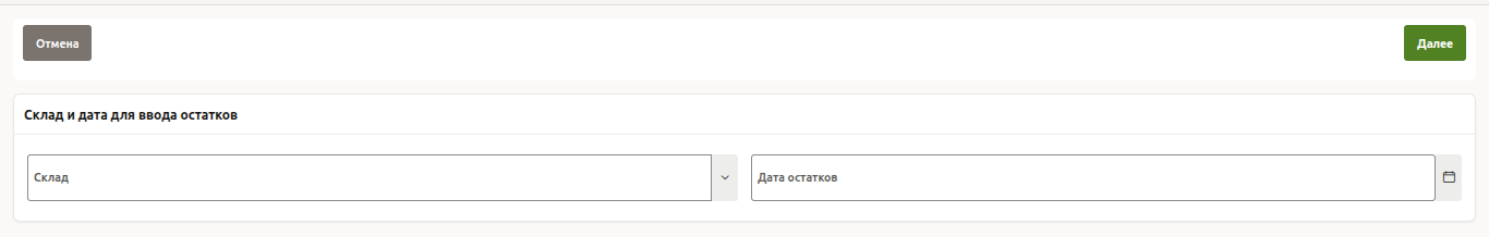 На этом этапе выбираем склад из выпадающего списка и вводим дату, на которую зафиксированы остатки.