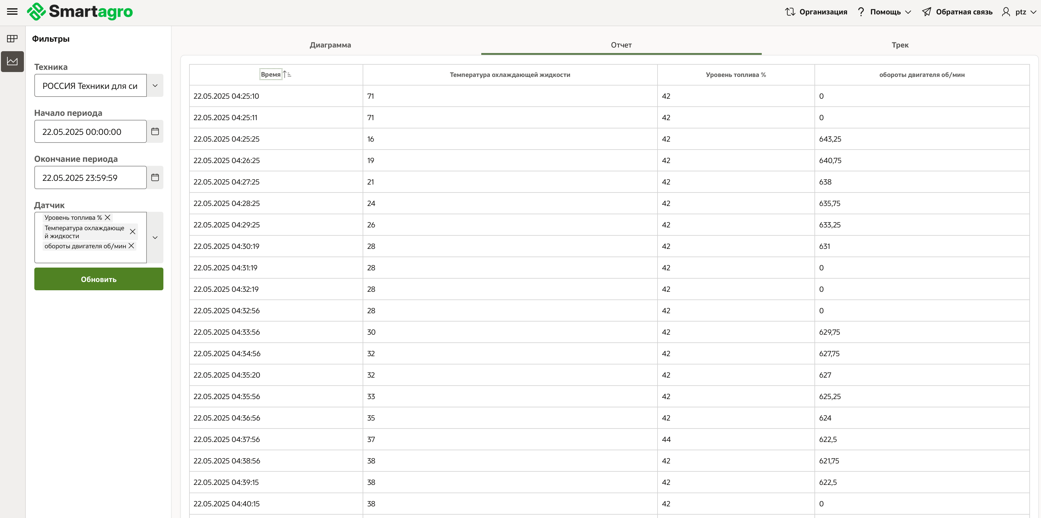 На данной странице представлен отчет по данным от датчиков транспортных средств. Отчет можно сформировать в формате Диаграмма, Таблица и Трек