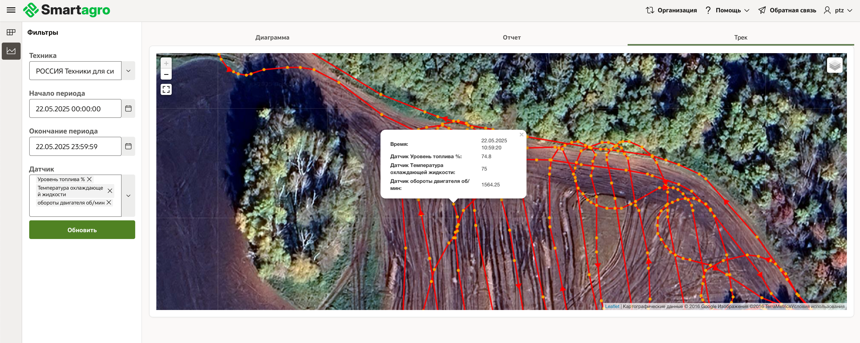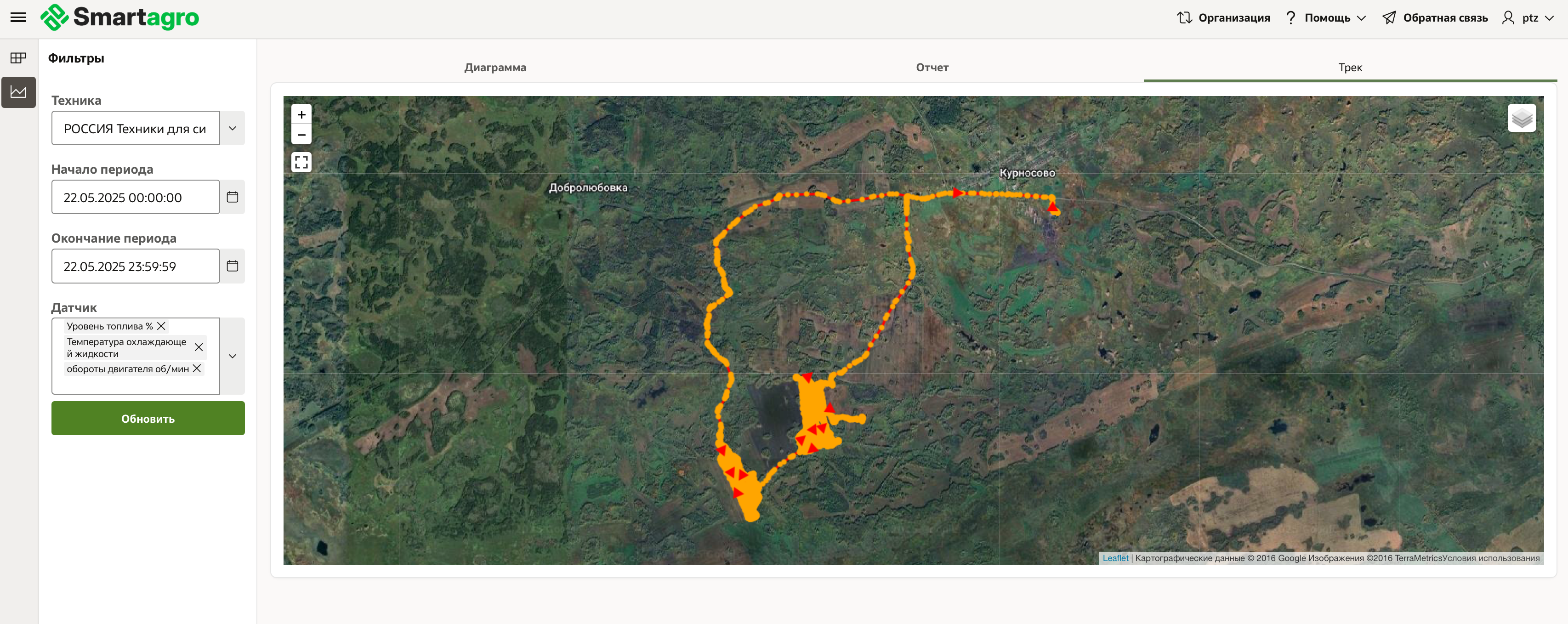В разделе "Трек" отображается карта с треком техники за выбранный период времени