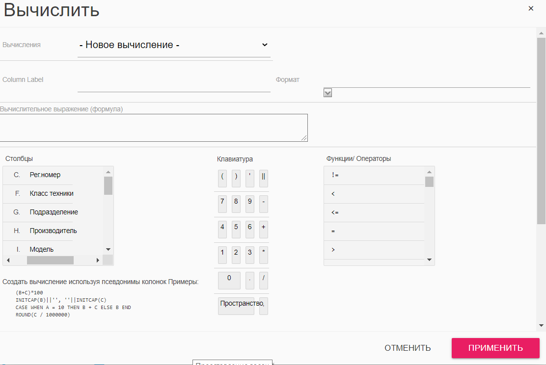 Под вычислением показываются столбцы запроса с соответствующими псевдонимами. Щелчок на названии или псевдониме столбца запишет его в расчет. Рядом со столбцами находится клавиатура. Это просто ссылки на часто используемые клавиши. Справа находятся функции.