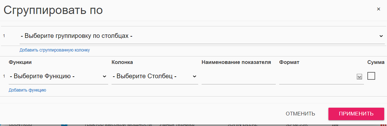 Позволяет создать группировку по столбцам для отчета. Для создания группировки по столбцам необходимо выбрать: