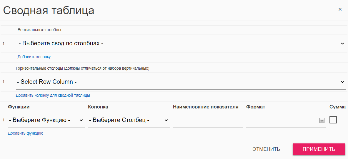 • Значение позволяет выбрать столбец, который будет использоваться для значений. Если функция - COUNT (Количество), значение выбирать не нужно.