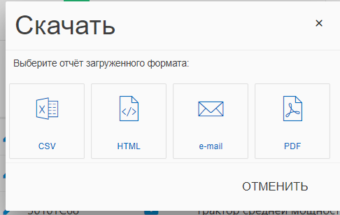 Позволяет выгрузить набор текущих результатов. Форматы закачки будут отличаться в зависимости от установки и определения отчетов, но могут включать CSV, XLS, PDF, или RTF.