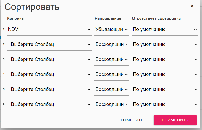 Используется для изменения сортировки в столбце и переключения режимов 'по возрастанию' и 'убыванию'. Также можно указывать, как обрабатывать поля, не содержащие значения (использовать настройку по умолчанию, всегда показывать последними или всегда показывать первым). Результат сортировки показывается справа от заголовка столбцов в отчете.