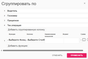 4. Далее необходимо нажать на строку "Выберите группировку по столбцам". Откроется выпадающий список, из него выбираем интересующий нас столбец. При необходимости вы можете выбрать несколько столбцов. Для этого нажмите "Добавить сгруппированную колонку", будет добавлена новая строка. Для примера возьмём следующие столбцы: