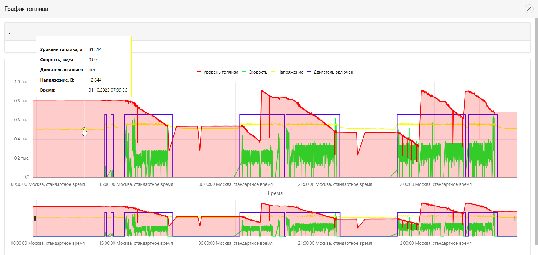 Навести курсор мыши на интересующую точку графика, чтобы отобразить подробную всплывающую подсказку (уровень топлива, скорость, напряжение, состояние двигателя, время).