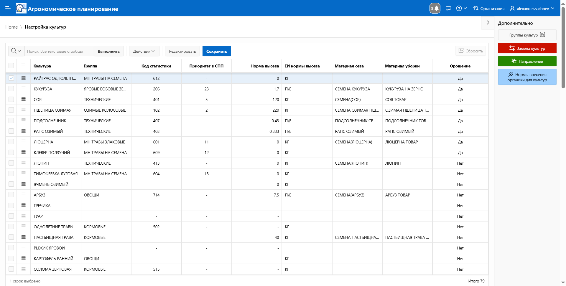 • Удаление записей: Не удаляйте культуры, на которые есть ссылки в планах или технологических картах. Используйте замену или деактивацию.