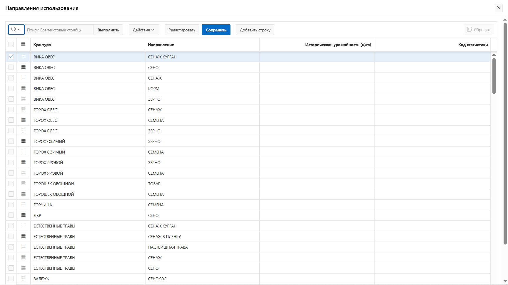 • Добавьте строку, указав Культуру и Направление использования её урожая.