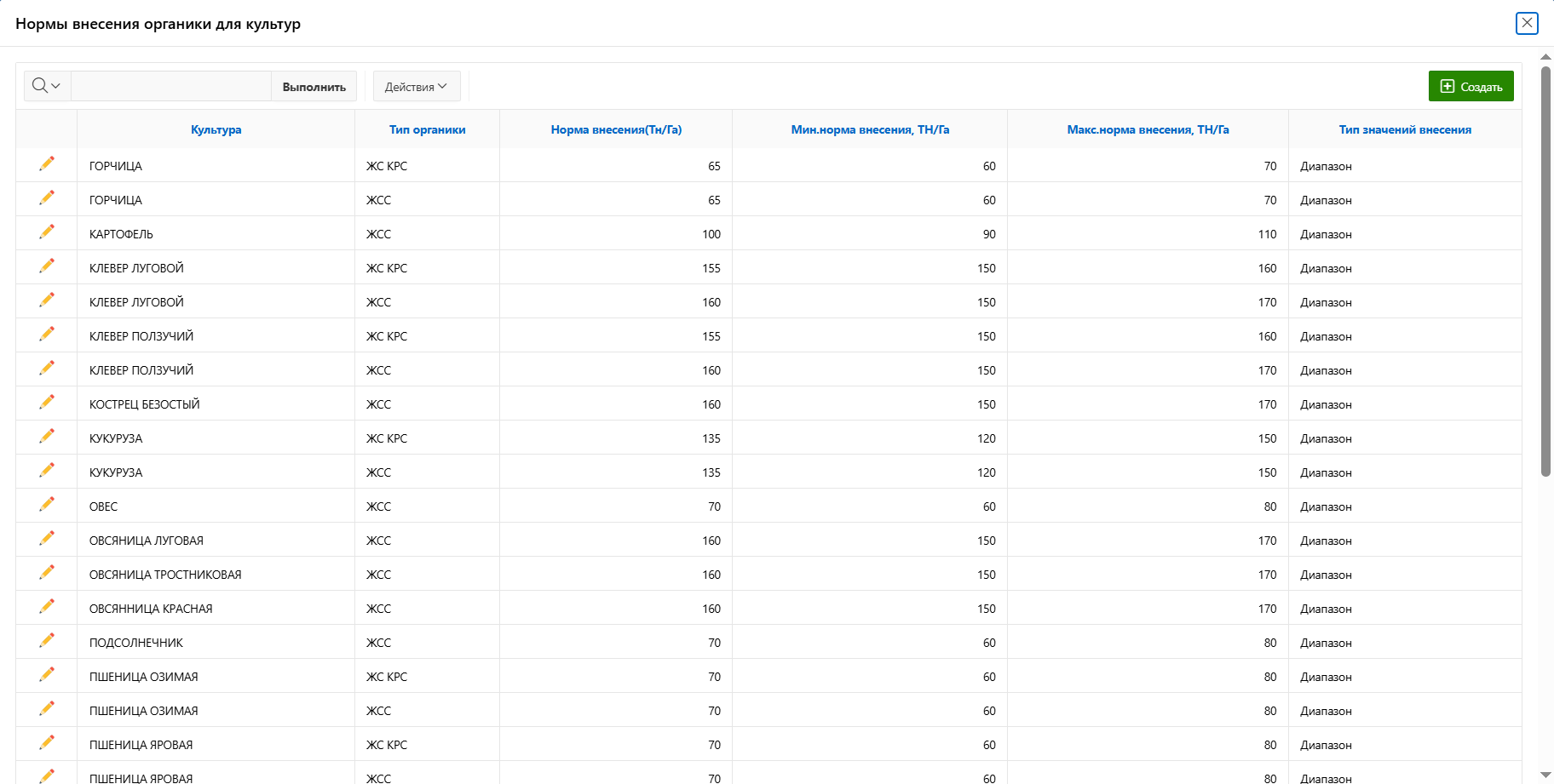 Рис. 5. Форма создания/редактирования нормы внесения органики.