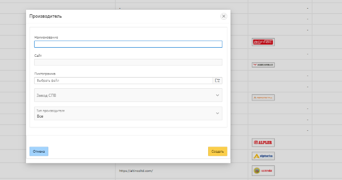 - Тип производителя - Используется для фильтрации производителей по типу, например при создании техники отображаются только производители с типом техника.
