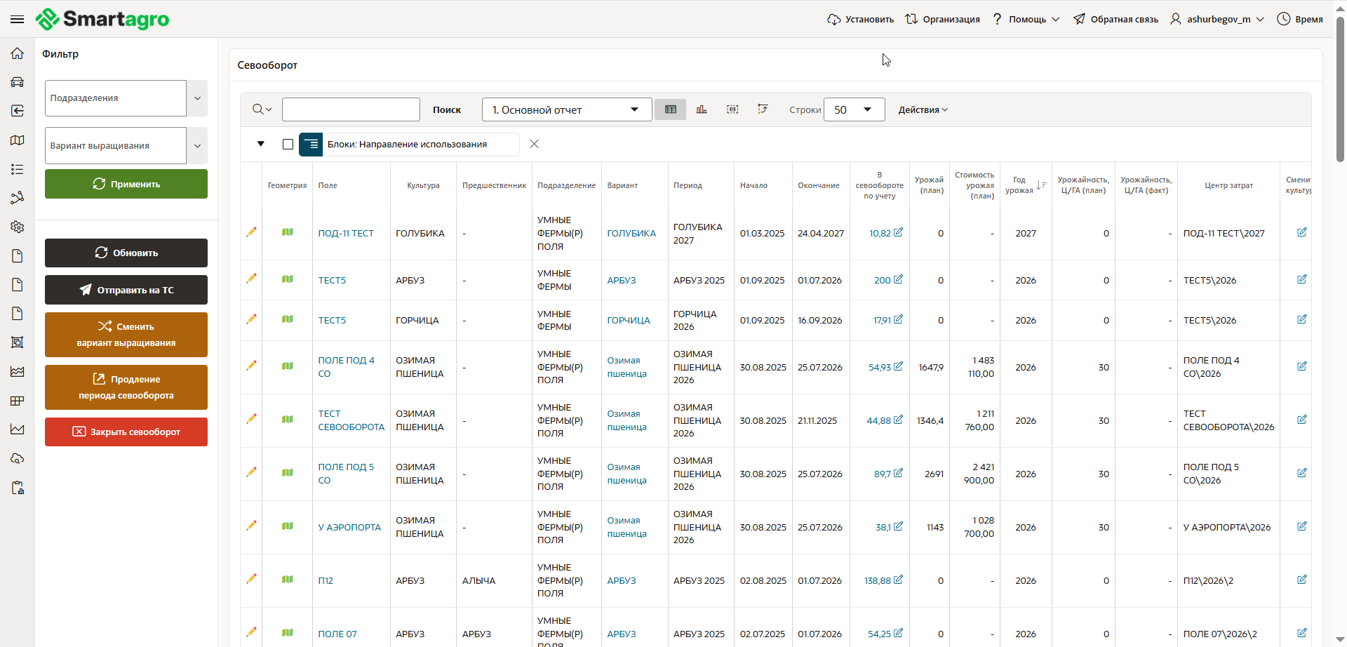 • На экране отобразится таблица со списком всех севооборотов предприятия