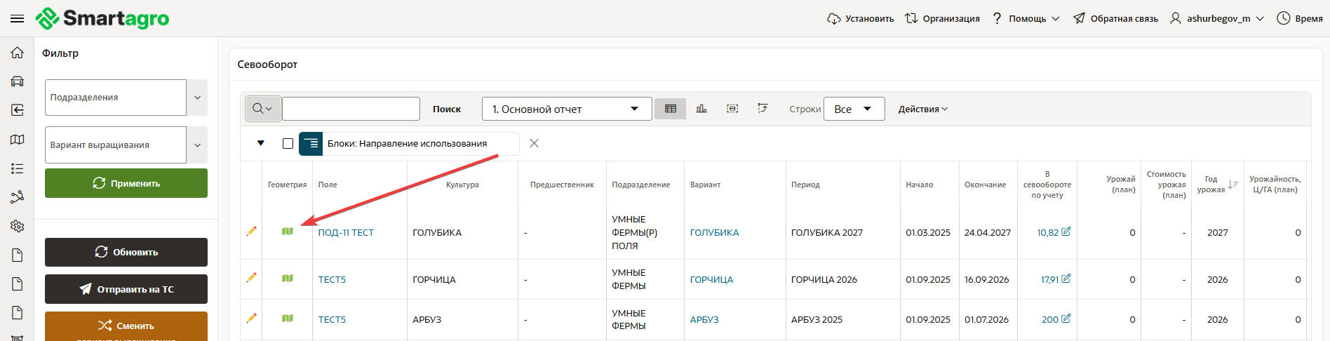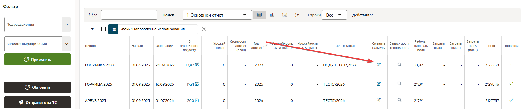 • В таблице севооборотов нажмите значок редактирования в строке нужного севооборота