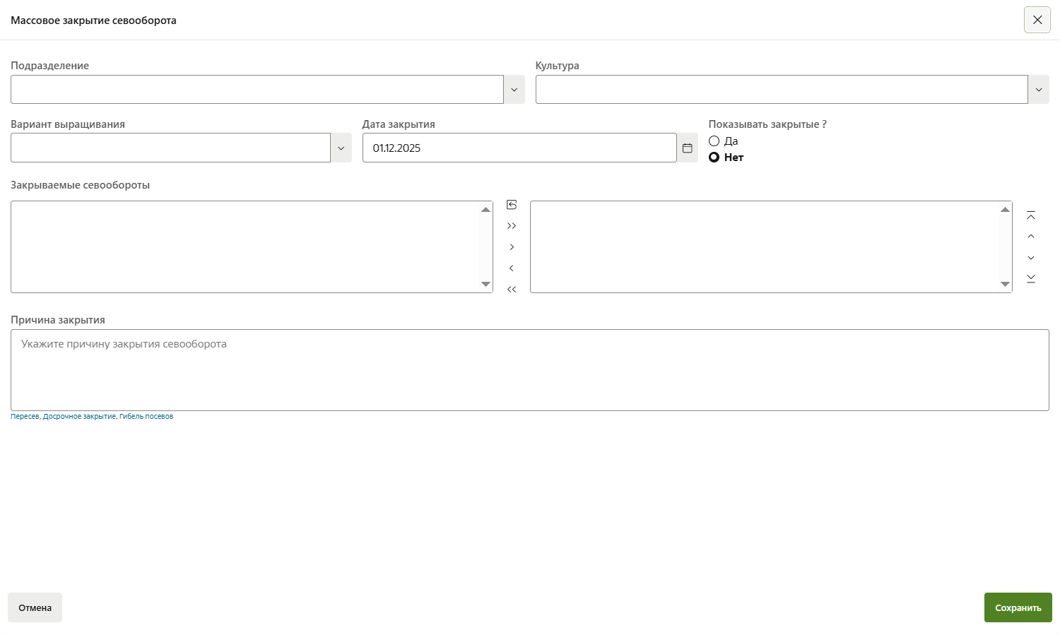 • В блоке "Закрываемые севообороты" выберите севообороты для закрытия