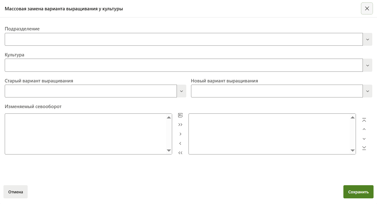 • Сменить вариант выращивания - массовая замена варианта выращивания