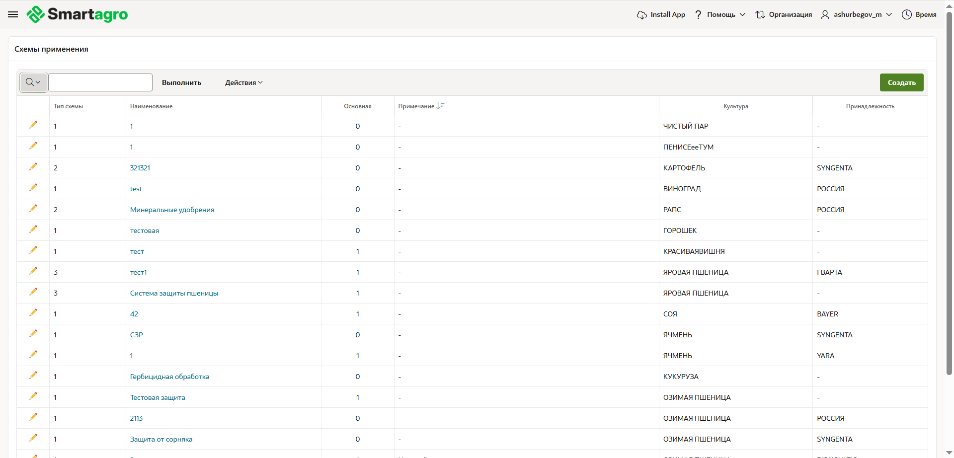 Модуль «Схемы применения» предназначен для создания, хранения и управления стандартными технологическими регламентами (схемами) применения материалов — средств защиты растений (СЗР) и удобрений — для конкретных культур и типов обработок.