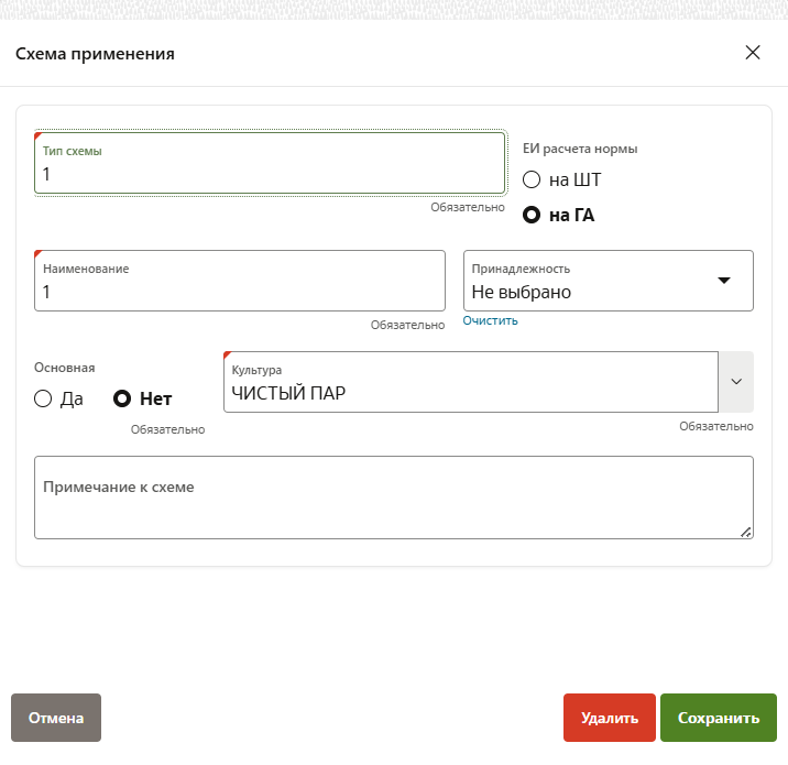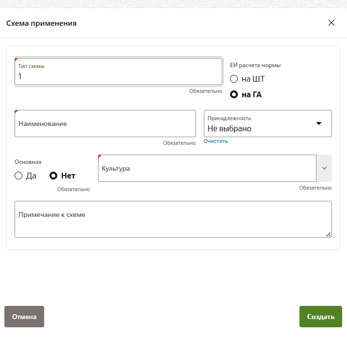 В открывшемся модальном окне заполните обязательные поля: Тип схемы, ЕИ расчета нормы, Наименование, Культура.
