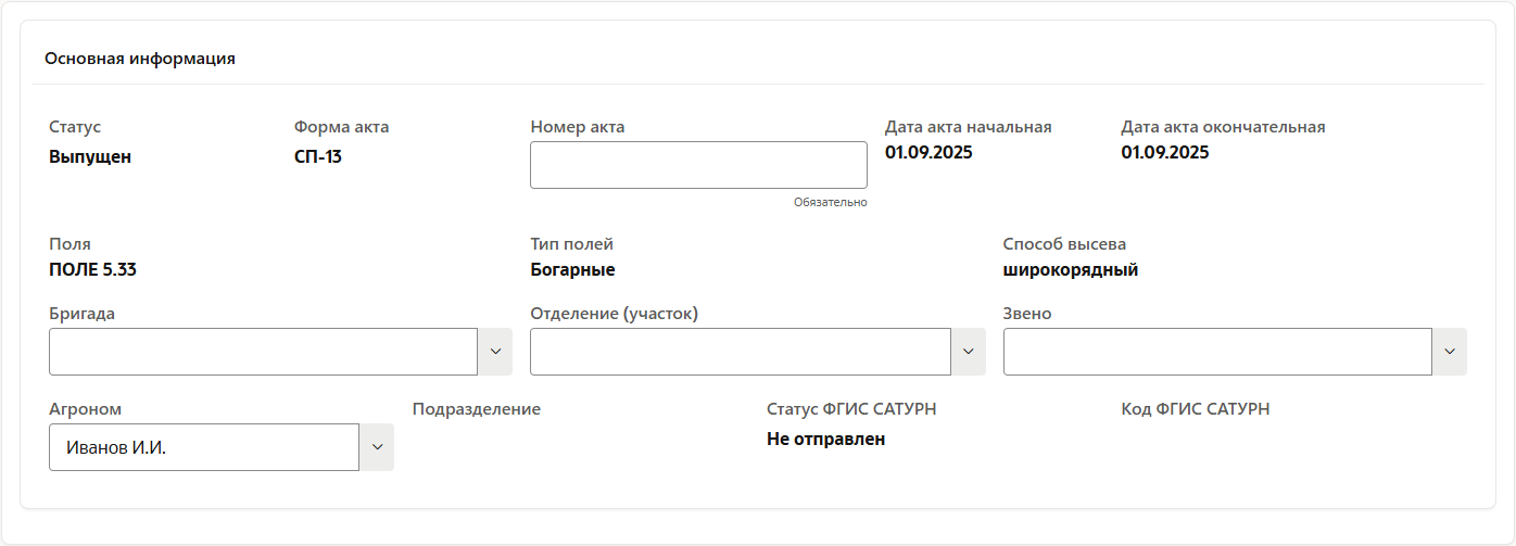 Можно изменить: Номер акта, Бригаду, Отделение (участок), Звено, Агронома, состав списаний.