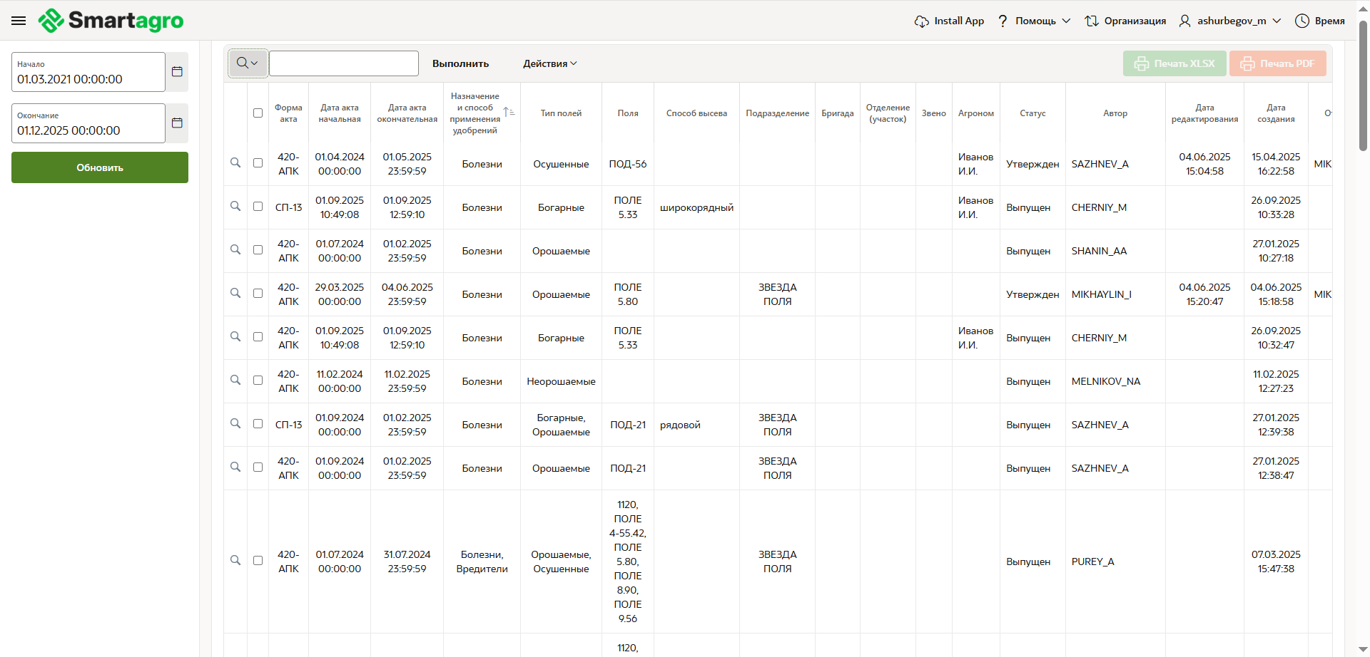 Детальный просмотр состава акта с аналитикой списаний по полям и культурам