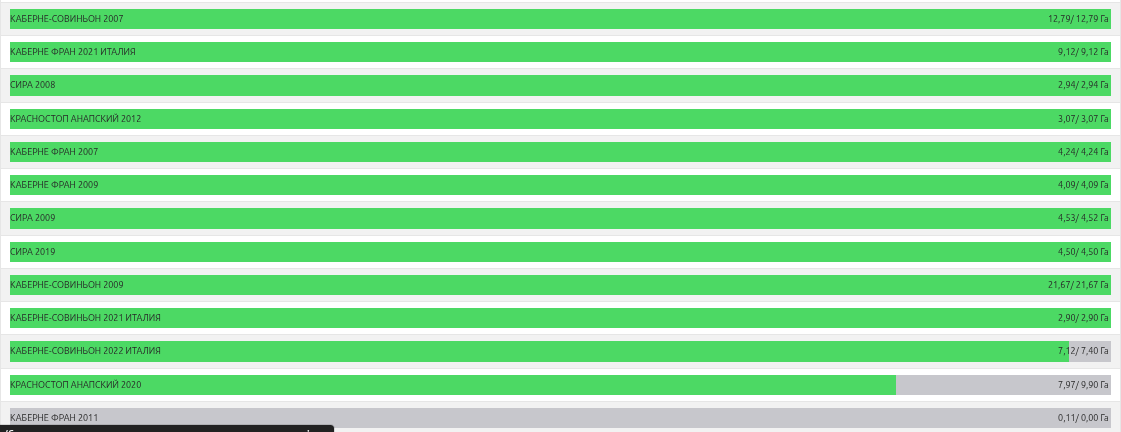 Раздел "Ход уборки винограда" позволяет отслеживать: