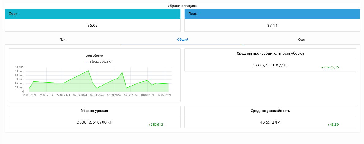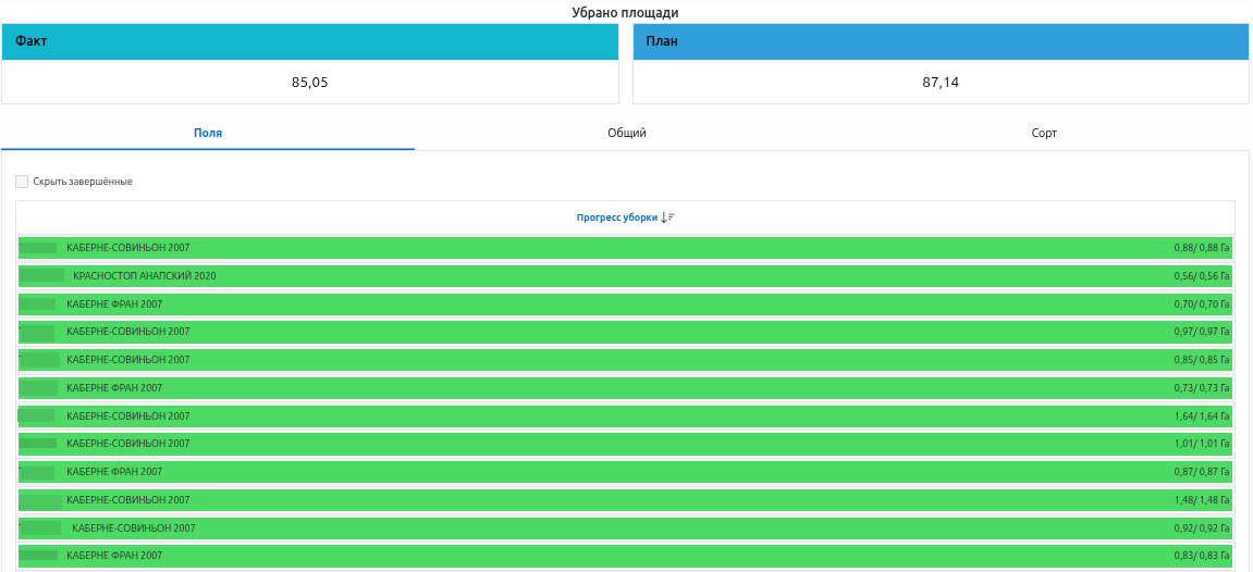 Прогресс уборки по каждому полю и сорту