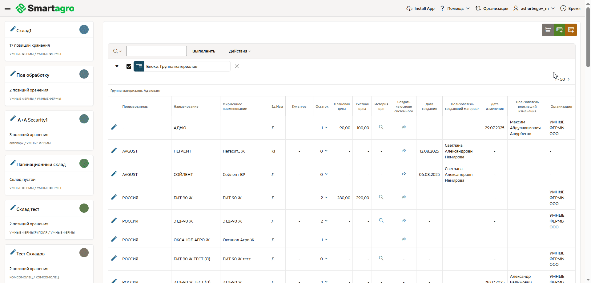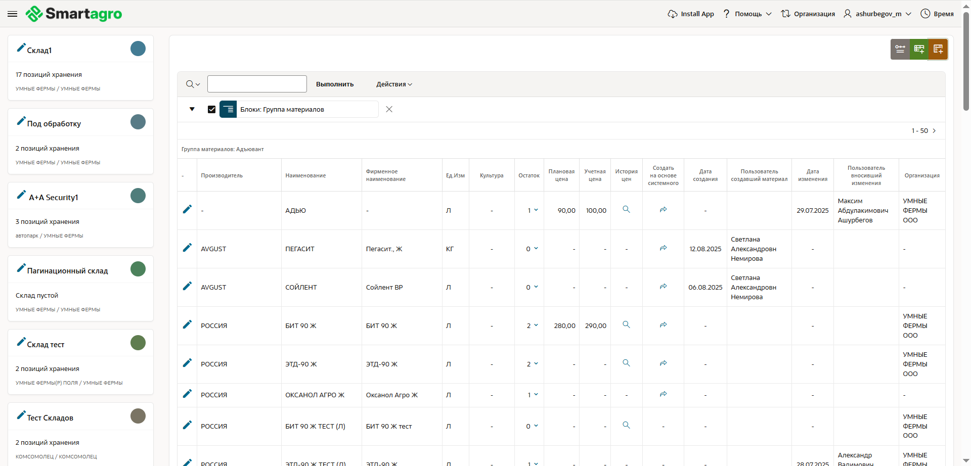 Модуль «Перечень материалов» является центральным справочником номенклатуры материальных ценностей предприятия. Он обеспечивает единую точку ввода и управления всеми материалами: от семян и удобрений до ГСМ и готовой продукции.