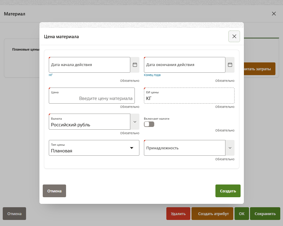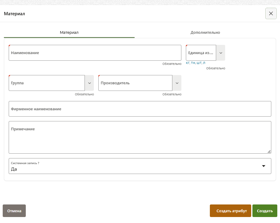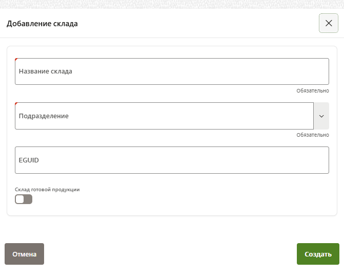 Обязательные поля: При создании склада и материала обязательно заполнение всех помеченных полей