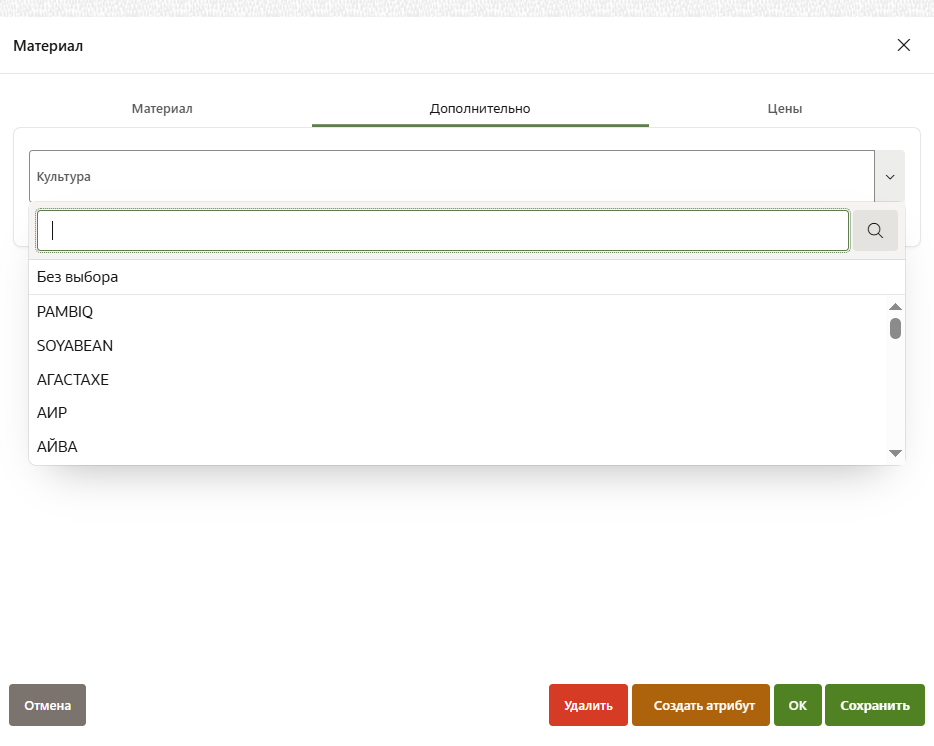 Обязательная привязка к культуре: Материалы групп "Семена" и "Продукция" должны быть привязаны к культуре во вкладке "Дополнительно"