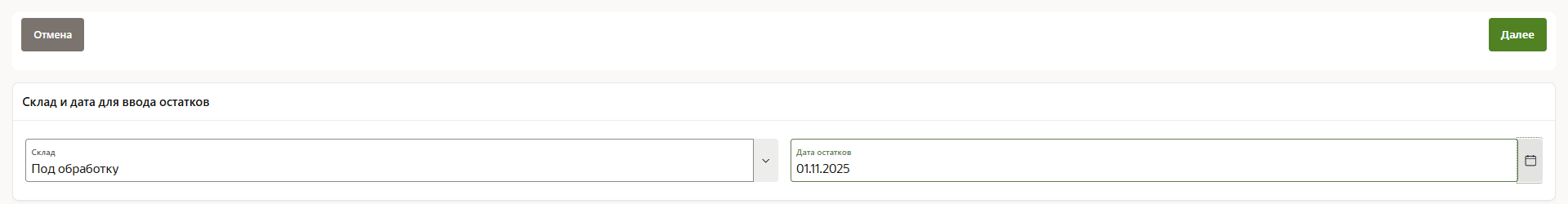 Рис. 7. Начало процесса ввода остатков