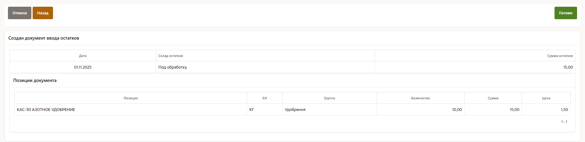 Система создаст документ ввода остатков