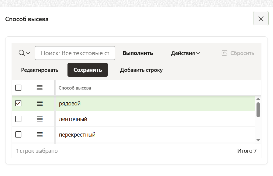 Ключевое поле: Способ высева — наименование агротехнического приема (например, «рядовой», «ленточный», «перекрестный»).