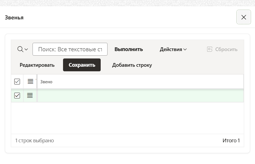 Панель действий — кнопки: «Редактировать», «Сохранить», «Добавить строку», «Сбросить»