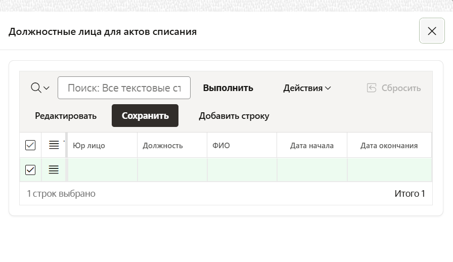 Назначение: Определяет исполнительную единицу и ответственное лицо для акта списания.
