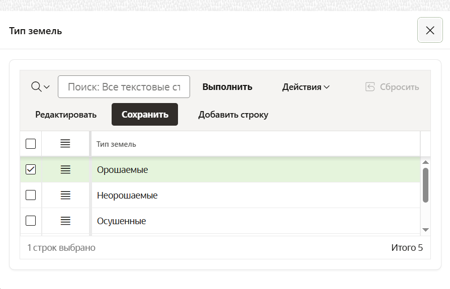 Ключевое поле: Тип земель — наименование типа (например, «Орошаемые», «Неорошаемые», «Осушенные»).