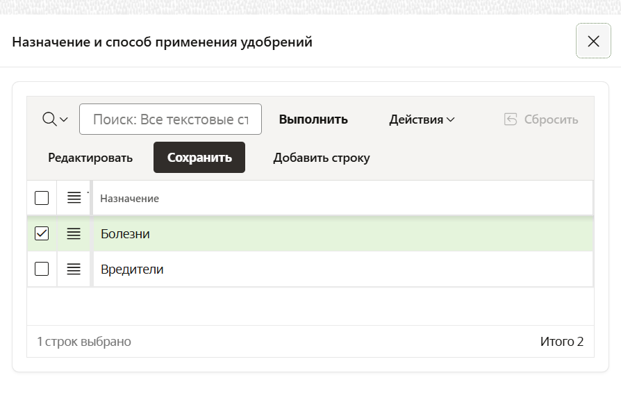Ключевое поле: Назначение и способ применения удобрений — наименование записи (например, «Болезни», «Вредители»).