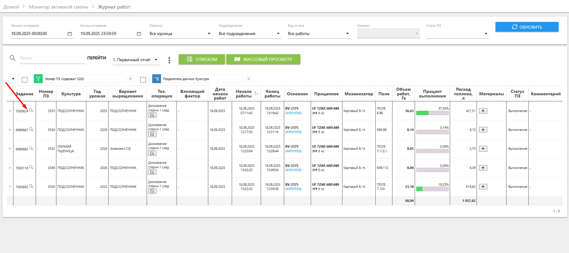 Для того, чтобы внести учетные единицы, необходимо для начала попасть в журнал работ (Управление работами → Журнал работ). Найти необходимую работу используя фильтры в верхней части страницы и провалиться в детали работ кликнув по лупе .