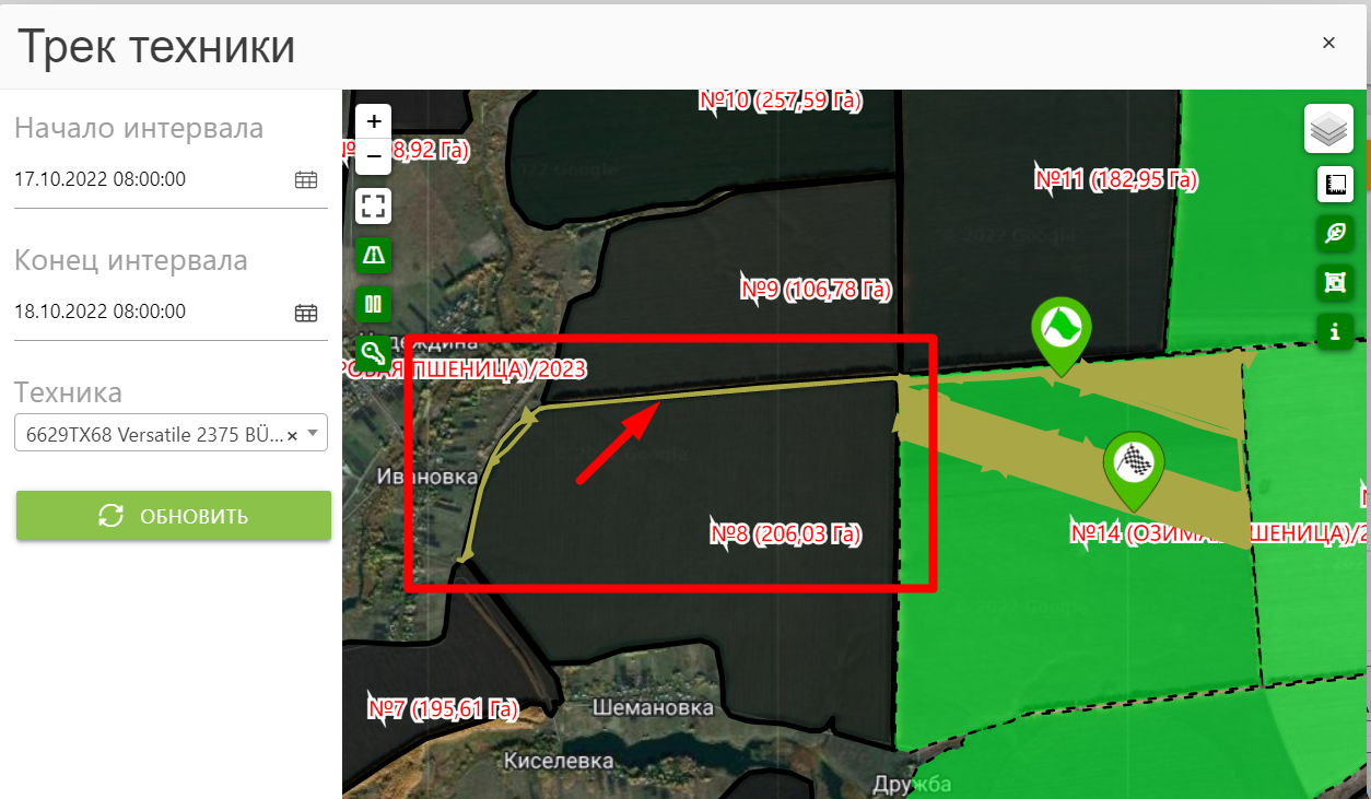 В мониторе диспетчера на одном и том же поле отображаются две культуры. На которых техника якобы работает в один и тот же момент
