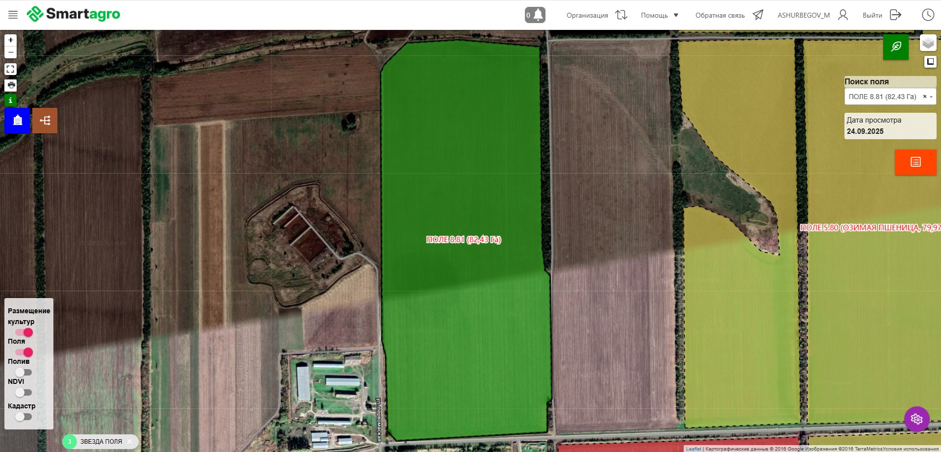 - Площадь поля или объекта логистики — Площадь по отрисованному в системе полю. Измеряется в гектарах