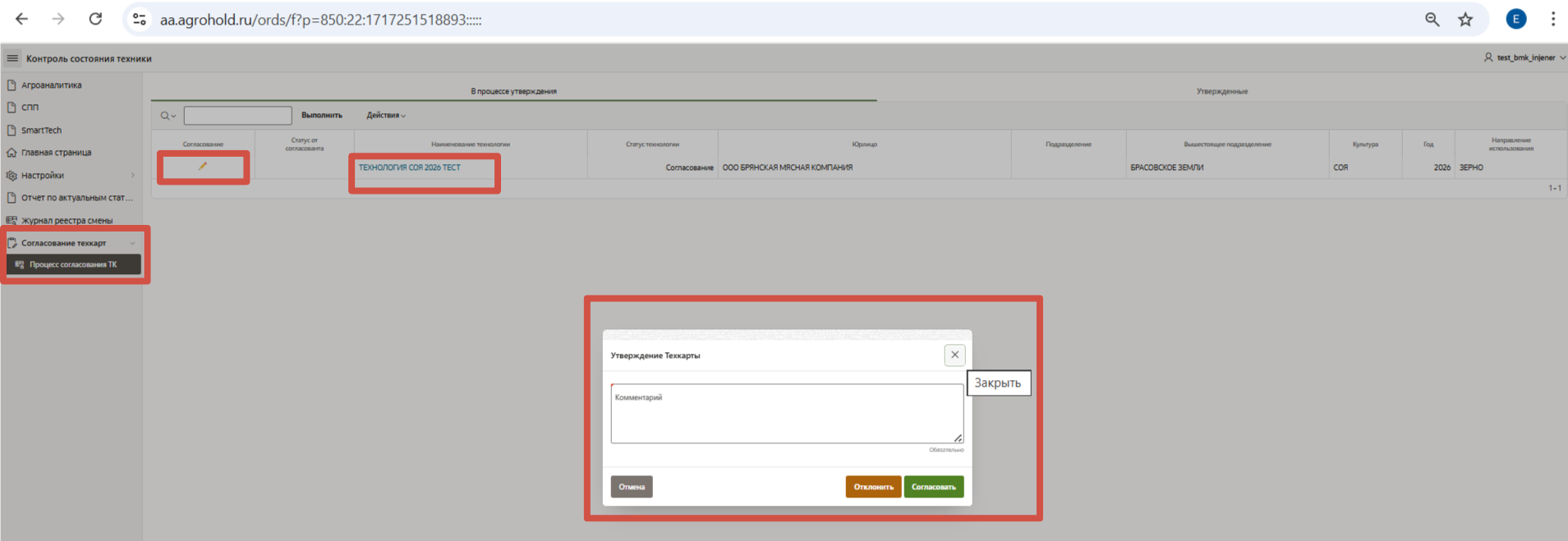 - После установки техкарте статуса "Согласование", она блокируется и становится недоступна для изменений. Техкарта становится доступной к изменениям и переходит в статус "Отклонено" после того, как ее отклонит хотя бы один из согласовантов.