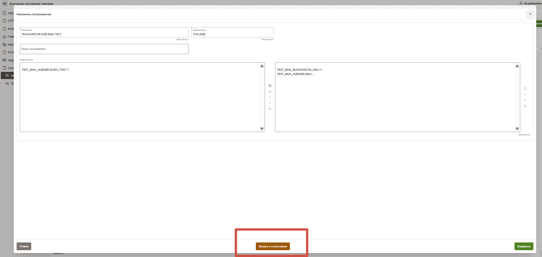 Рисунок 7.2 - Окно возврата ТК в согласование