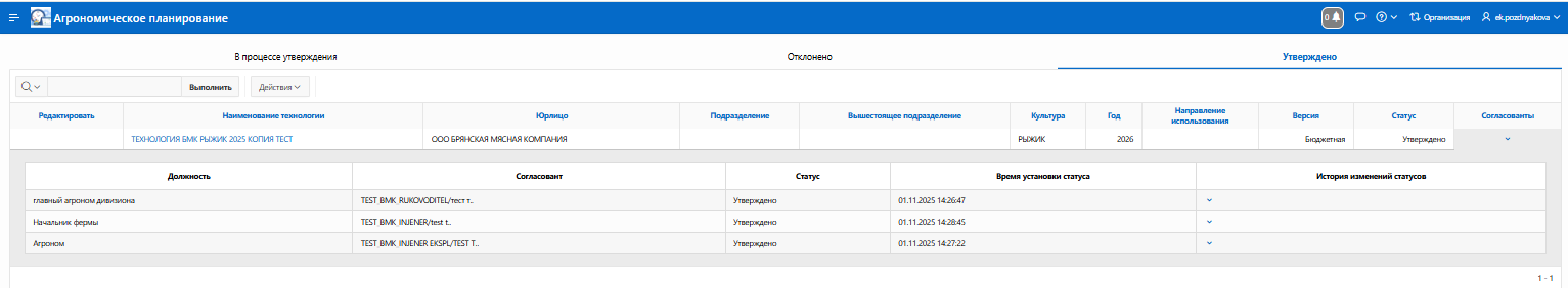 Рисунок 8 - Просмотр статуса согласования - На вкладке "Согласовано" можно просмотреть все согласованные техкарты, на вкладке "Отклонено" - только отклоненные.