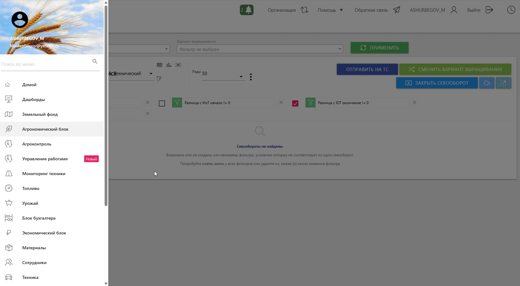 Контроль целостности данных: Система проверяет наличие незавершенных работ и открытых севооборотов, предотвращая потерю данных.